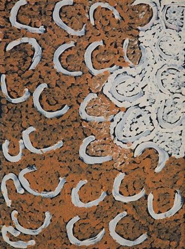 This is Mayiwalku’s Country- her ‘ngurra’ (home Country, camp). People identify with their ngurra in terms of specific rights and responsibilities, and the possession of intimate knowledge of the physical and cultural properties of one’s Country. Painting ngurra, and in so doing sharing the Jukurrpa (Dreaming) stories and physical characteristics of that place, has today become an important means of cultural maintenance.