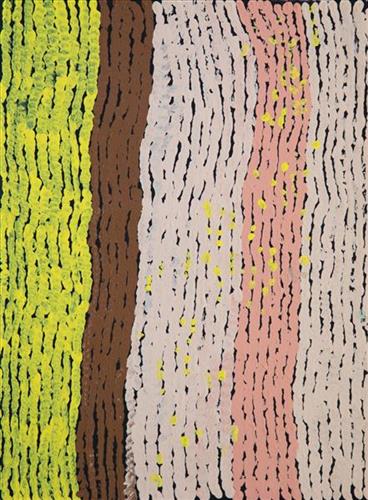 This is Mayiwalku’s Country- her ‘ngurra’ (home Country, camp). People identify with their ngurra in terms of specific rights and responsibilities, and the possession of intimate knowledge of the physical and cultural properties of one’s Country. Painting ngurra, and in so doing sharing the Jukurrpa (Dreaming) stories and physical characteristics of that place, has today become an important means of cultural maintenance.