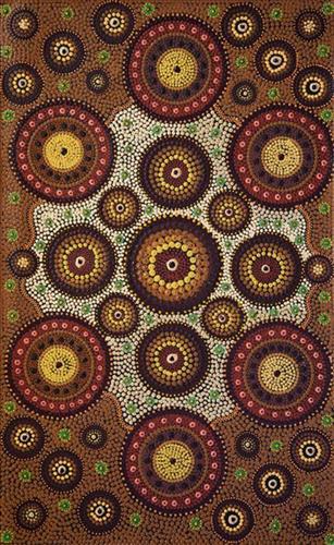 Younger Martu artists often start painting alongside their parents, grandparents, and extended family, which fosters an organic learning process. This not only involves mastering painting techniques but also understanding specific locations, family histories, traditional ways of life, bush tucker, and Jukurrpa (Dreaming). Over time, with encouragement from their peers, they develop their own distinct styles and explore unique painting techniques and subject matter. In this work the artist brings a contemporary, evolving perspective to their work.
