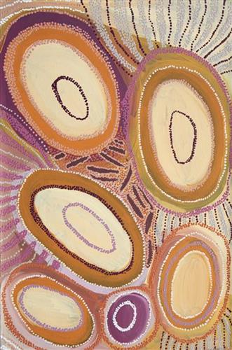 I'm [also] a Martumili artist. I come to Martumili to paint about my Country, where my grandfather walked around and collected food, and visited the same rockholes I do. I paint to keep my culture and stories and share with others. Sometimes I paint with my nanna Jakayu [Biljabu] (dec.). I learn from her a little bit. My skin name is Milangka, and Kaalpa (Kalypa, Canning Stock Route Well 23) is my grandfather’s Country. I was really happy to go see my grandfather's Country- pukurlpa (happy). When I paint I feel like its home. Doing it on the canvas, I feel like I'm standing there back at home."