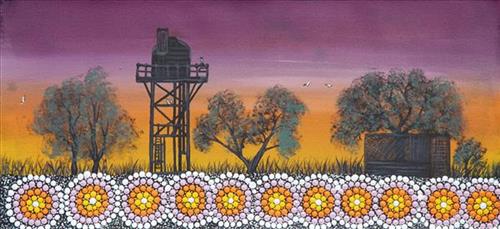 Younger Martu artists often start painting alongside their parents, grandparents, and extended family, which fosters an organic learning process. This not only involves mastering painting techniques but also understanding specific locations, family histories, traditional ways of life, bush tucker, and Jukurrpa (Dreaming). Over time, with encouragement from their peers, they develop their own distinct styles and explore unique painting techniques and subject matter. In this work the artist brings a contemporary, evolving perspective to their work.