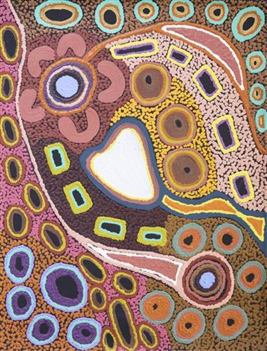 In this work Marlene depicts a waterhole and rock hole located in Mungili, the small outstation community located just off the Eagle Highway in Western Australia, approximately 430 kilometres northeast of Wiluna and 250 kilometres north of Warburton. Marlene grew up in Mungili, and as such it forms a significant part of her ‘ngurra’ (home Country, camp). Typically Marlene depicts this site with a central large circular form that represents the main waterhole, surrounded by smaller circular forms representing satellite water bodies.