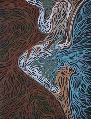 Bidyadanga is Ciarn’s Country - her ‘ngurra’ (home Country, camp). People identify with their ngurra in terms of specific rights and responsibilities, and the possession of intimate knowledge of the physical and cultural properties of one’s Country. Painting ngurra, and in so doing sharing the Jukurrpa (Dreaming) stories and physical characteristics of that place, has today become an important means of cultural maintenance. Common motifs depicted in her work relate specifically to her heritage of both saltwater country and desert, including marine animals, depictions of water, as well as desert landscapes.