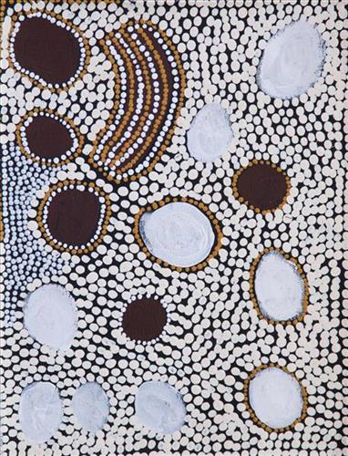 In this work Matthew depicts a claypan located in Mungili, the small outstation community situated just off the Eagle Highway in Western Australia. Mungili lies approximately 430 kilometres northeast of Wiluna and 250 kilometres north of Warburton. Mungili is ngurra (home (home Country, camp) for Matthew through his mother and grandmother. He typically depicts the site with a central large circular form that represents the main claypan, surrounded by smaller circular forms symbolising satellite water bodies.