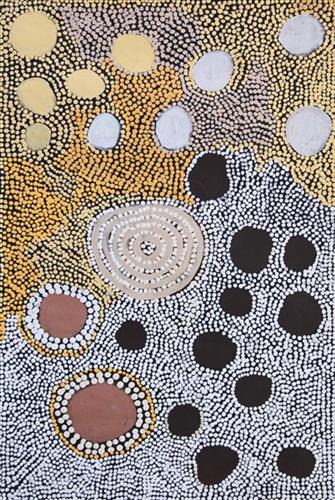 In this work Matthew depicts a claypan located in Mungili, the small outstation community situated just off the Eagle Highway in Western Australia. Mungili lies approximately 430 kilometres northeast of Wiluna and 250 kilometres north of Warburton. Mungili is ngurra (home (home Country, camp) for Matthew through his mother and grandmother. He typically depicts the site with a central large circular form that represents the main claypan, surrounded by smaller circular forms symbolising satellite water bodies.