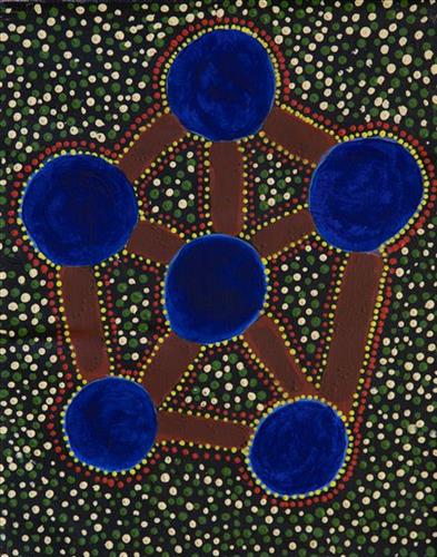 Younger Martu artists often start painting alongside their parents, grandparents, and extended family, which fosters an organic learning process. This not only involves mastering painting techniques but also understanding specific locations, family histories, traditional ways of life, bush tucker, and Jukurrpa (Dreaming). Over time, with encouragement from their peers, they develop their own distinct styles and explore unique painting techniques and subject matter. In this work the artist brings a contemporary, evolving perspective to their work.