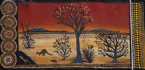 Younger Martu artists often start painting alongside their parents, grandparents, and extended family, which fosters an organic learning process. This not only involves mastering painting techniques but also understanding specific locations, family histories, traditional ways of life, bush tucker, and Jukurrpa (Dreaming). Over time, with encouragement from their peers, they develop their own distinct styles and explore unique painting techniques and subject matter. In this work the artist brings a contemporary, evolving perspective to their work.