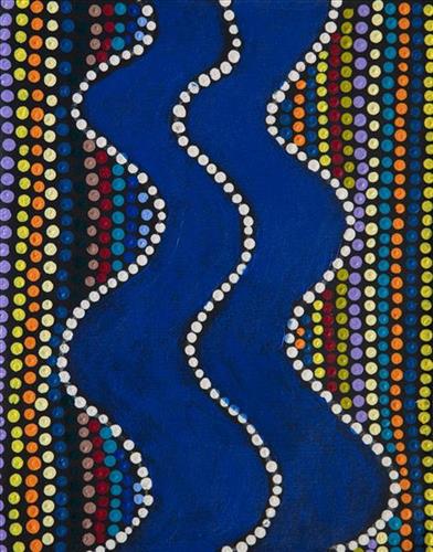 Younger Martu artists often start painting alongside their parents, grandparents, and extended family, which fosters an organic learning process. This not only involves mastering painting techniques but also understanding specific locations, family histories, traditional ways of life, bush tucker, and Jukurrpa (Dreaming). Over time, with encouragement from their peers, they develop their own distinct styles and explore unique painting techniques and subject matter. In this work the artist brings a contemporary, evolving perspective to their work.