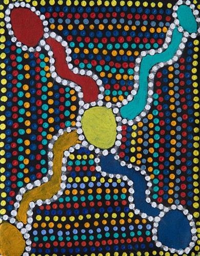 Younger Martu artists often start painting alongside their parents, grandparents, and extended family, which fosters an organic learning process. This not only involves mastering painting techniques but also understanding specific locations, family histories, traditional ways of life, bush tucker, and Jukurrpa (Dreaming). Over time, with encouragement from their peers, they develop their own distinct styles and explore unique painting techniques and subject matter. In this work the artist brings a contemporary, evolving perspective to their work.
