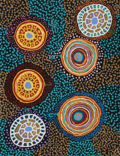 In this work Marlene depicts a waterhole and rock hole located in Mungili, the small outstation community located just off the Eagle Highway in Western Australia, approximately 430 kilometres northeast of Wiluna and 250 kilometres north of Warburton. Marlene grew up in Mungili, and as such it forms a significant part of her ‘ngurra’ (home Country, camp). Typically Marlene depicts this site with a central large circular form that represents the main waterhole, surrounded by smaller circular forms representing satellite water bodies.