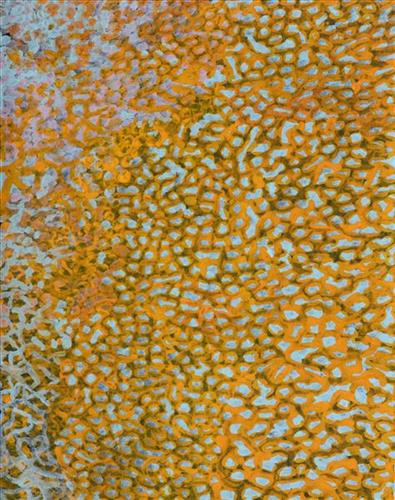 Muuki paints Kulyakartu in all its different seasonal stages. Often visible in his work is the patchwork nature of regrowth subsequent to the practice of waru (fire) burning that assists with hunting, regenerates growth, and encourages greater diversity in plant and animal life. This mosaic patterning is aligned with the five distinct Martu cyclical phases of burning and regrowth. First is nyurnma (freshly burnt Country) when Muuki is “making waru”. Following nyurnma are the rains and subsequent waru-waru, when young, bright green plants start to grow. Nyukura occurs between one and three years after burning, when plants have matured and are fruiting and seeding. Manguu is “when him finished”, four to six years post burning, and when spinifex has matured to the point that it can be burned once again. Finally, kunarka signifies the time when spinifex and other plant species have become old growth, and pose a risk of destructive bushfires.