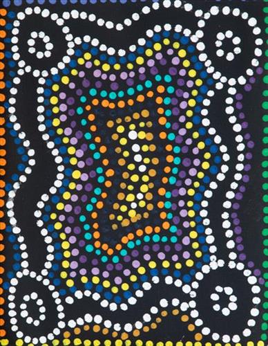 Younger Martu artists often start painting alongside their parents, grandparents, and extended family, which fosters an organic learning process. This not only involves mastering painting techniques but also understanding specific locations, family histories, traditional ways of life, bush tucker, and Jukurrpa (Dreaming). Over time, with encouragement from their peers, they develop their own distinct styles and explore unique painting techniques and subject matter. In this work the artist brings a contemporary, evolving perspective to their work.