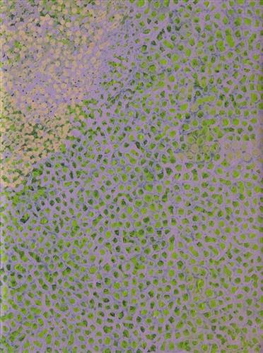 Muuki paints Kulyakartu in all its different seasonal stages. Often visible in his work is the patchwork nature of regrowth subsequent to the practice of waru (fire) burning that assists with hunting, regenerates growth, and encourages greater diversity in plant and animal life. This mosaic patterning is aligned with the five distinct Martu cyclical phases of burning and regrowth. First is nyurnma (freshly burnt Country) when Muuki is “making waru”. Following nyurnma are the rains and subsequent waru-waru, when young, bright green plants start to grow. Nyukura occurs between one and three years after burning, when plants have matured and are fruiting and seeding. Manguu is “when him finished”, four to six years post burning, and when spinifex has matured to the point that it can be burned once again. Finally, kunarka signifies the time when spinifex and other plant species have become old growth, and pose a risk of destructive bushfires.