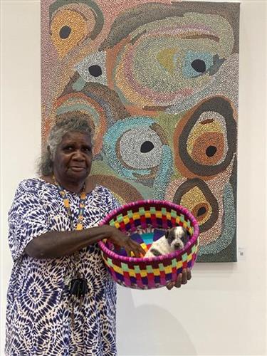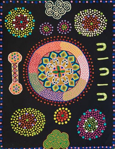 Younger Martu artists often start painting alongside their parents, grandparents, and extended family, which fosters an organic learning process. This not only involves mastering painting techniques but also understanding specific locations, family histories, traditional ways of life, bush tucker, and Jukurrpa (Dreaming). Over time, with encouragement from their peers, they develop their own distinct styles and explore unique painting techniques and subject matter. In this work the artist brings a contemporary, evolving perspective to their work.