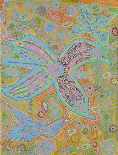 Younger Martu artists often start painting alongside their parents, grandparents, and extended family, which fosters an organic learning process. This not only involves mastering painting techniques but also understanding specific locations, family histories, traditional ways of life, bush tucker, and Jukurrpa (Dreaming). Over time, with encouragement from their peers, they develop their own distinct styles and explore unique painting techniques and subject matter. In this work the artist brings a contemporary, evolving perspective to their work.