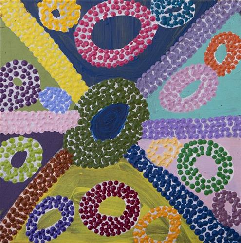 Younger Martu artists often start painting alongside their parents, grandparents, and extended family, which fosters an organic learning process. This not only involves mastering painting techniques but also understanding specific locations, family histories, traditional ways of life, bush tucker, and Jukurrpa (Dreaming). Over time, with encouragement from their peers, they develop their own distinct styles and explore unique painting techniques and subject matter. In this work the artist brings a contemporary, evolving perspective to their work.