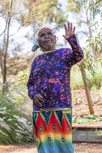 [As a child, Ngamaru walked around with her family, living a pujiman (traditional, desert dwelling) lifestyle. In 1963 Ngamaru saw a whitefella for the first time near Wiirnukurrujunu rockhole; surveyor Len Beadell grading a road across the desert as part of a military weapons testing program. Shortly after this meeting Ngamaru, along with the other 28 Martu she had been travelling with, was tracked and pursued by the Native Welfare Department. The group was eventually persuaded to move to Jigalong mission to join their relatives that had already moved in from the desert.]