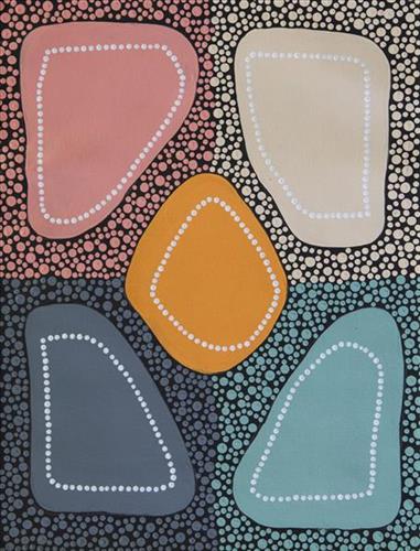 Younger Martu artists often start painting alongside their parents, grandparents, and extended family, which fosters an organic learning process. This not only involves mastering painting techniques but also understanding specific locations, family histories, traditional ways of life, bush tucker, and Jukurrpa (Dreaming). Over time, with encouragement from their peers, they develop their own distinct styles and explore unique painting techniques and subject matter. In this work the artist brings a contemporary, evolving perspective to their work.