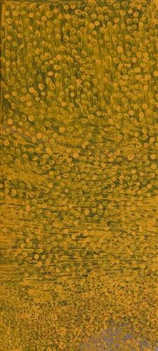 This is Muuki’s Country- his ‘ngurra’ (home Country, camp). People identify with their ngurra in terms of specific rights and responsibilities, and the possession of intimate knowledge of the physical and cultural properties of one’s Country. Painting ngurra, and in so doing sharing the Jukurrpa (Dreaming) stories and physical characteristics of that place, has today become an important means of cultural maintenance.