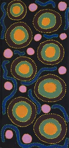 Younger Martu artists often start painting alongside their parents, grandparents, and extended family, which fosters an organic learning process. This not only involves mastering painting techniques but also understanding specific locations, family histories, traditional ways of life, bush tucker, and Jukurrpa (Dreaming). Over time, with encouragement from their peers, they develop their own distinct styles and explore unique painting techniques and subject matter. In this work the artist brings a contemporary, evolving perspective to their work.