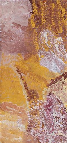 From Jigalong, Bugai moved to Aboriginal communities in Strelley, Punmu, and Parnngurr before relocating to Kunawarritji Aboriginal community, where she continues to live today. There she was taught to paint by renowned artists Nora Nungabar (Nyangapa) (dec.) and Nora Wompi (dec.). The three women painted together as often as possible. For a long time before she began painting, Bugai wove baskets as she observed her friends painting. Later, she explained that she had been uncertain how to begin.