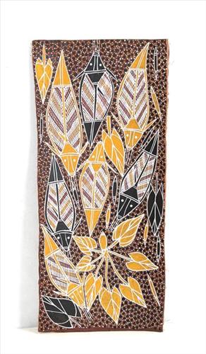 This is a depiction of Ngalkunburriyaymi or Yawkyawk, the fish-women spirit. Sometimes compared to the European notion of mermaids, they exist as spiritual beings living in freshwater streams, particularly those in the stone country. These water spirits are perhaps the most enigmatic, and are usually described and depicted with the tails of fish. Thus the Kuninjku people sometime call them ngalberddjenj which literally means ‘the woman who has a tail like a fish’. They have long hair which is associated with trailing blooms of green algae (man-bak in Kuninjku) found in freshwater streams and rock pools. At times they leave their aquatic homes to walk about on dry land, particularly at night.