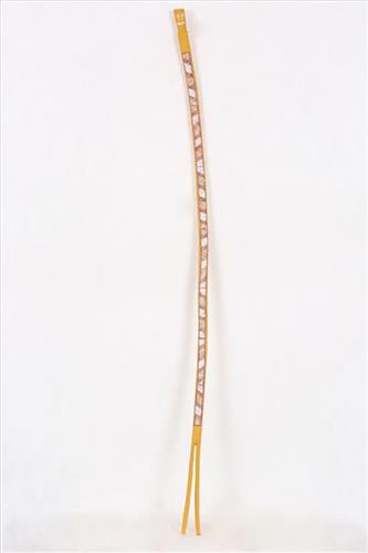 The mimih sits within a complex pedagogical and religious body of knowledge which links Kuninjku people to their distinctive escarpment homelands. Young Kuninjku artists, or apprentices, employ the mimih as an important exercise for the practice of the rarrk technique, as it could be achieved on a smaller surface area before being attempted in larger scale on pieces of bark. The mimih serves a purpose for those young artists first learning to carve in a social space of sharing and innovating. The initial mimih manifestation was a large form that almost mirrored the anatomy of a human and at this stage the sculptures have been likened to mokuy carvings visible in eastern Arnhem Land. Contemporaneously, mimih are depicted in a refined, slender, even emaciated form with a broad range of facial expressions giving both individual character to, and denoting the potential volatility and humour that mimih spirits are notable for in their interaction with bininj (humans). The sculptures are frequently carved from the thin trunks of softwoods such as kapok (bombax ceiba or cottonwood) kurrajong, beach hibiscus or leichardt and are painted with earth pigments for their colouring and design.