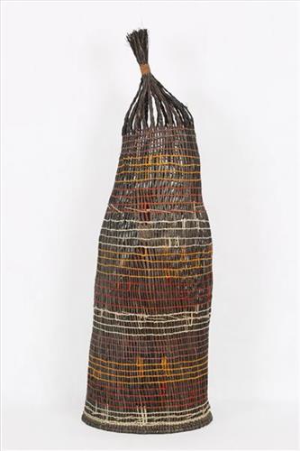 To make fish traps and fish net fences artists firstly get vine (mirlarl) from the jungle and they put it in water for one night to make it soft. Next they start weaving it; they make rings for the inside to keep the fish trap’s shape. Artists work for three or four weeks on the fish trap. They also make string from kurrajong (burdaga) to attach the hibiscus (bardainy) rings and to tie the conical end of the fish trap. This fish trap is used in saltwater and freshwater. People also use fish net fences called mun-dirra. A long time ago they would put the mun-dirra across rivers and creeks. In the middle they would place the an-gujechiya. They also used small things like sticks, rocks, mud and grass to block the fish from going through. People would then catch fish like saltwater barramundi rajarra, freshwater barramundi (janambal), small black freshwater catfish (buliya), bonefish (an-guwirrpiya), and sand bass (dalakan) in these fish traps.
