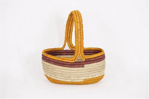 Artists make coiled baskets of many shapes and sizes, ranging from small round baskets to large oval baby baskets, and made mostly from pandanus fibre that is dyed with natural pigments. Bundles of fibre are formed into coils which are covered and stitched together with strands of fibre threaded onto a needle. Artists combine colours and patterns to obtain intricate new graphic patterns.