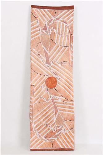 This painting depicts two goannas embedded in an intricate depiction of kunkurra, the mini cyclones common during the wet season in Arnhem Land. Kunkurra also relates specifically to the Bilwoyinj site. At this site, two of the most important Kuninjku creation beings, a father and son, hunted and ate goanna. They left some goanna fat behind, which turned into the rock that still stands at the site today.