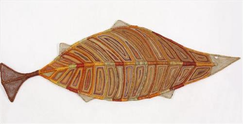 It is well known that Aboriginal art often depicts images of sacred totems or dreamings of Aboriginal culture. However, the world of the non-sacred also provides a rich source of subject matter for Aboriginal art. Much of the rock art of western Arnhem Land for example features secular topics such as common food animals and plants, depicted because of their economic importance but also merely because of their existence in the environment. The artist has depicted ‘birlmu’ or ‘namarnkorl’ (Barramundi [Lates calcarifer]). During the dry season the barramundi is an important food source for inland Aboriginal people. These fish are caught throughout the artist’s clan estate, either in fishtraps woven from pandanus or sedge grass, or else hunted with spears and fishing lines in billabongs and streams where they shelter from the sun under fallen logs or amongst the leaves of water plants.