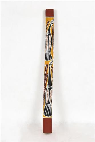 This artist has painted designs for two clans: Mapuy and Warrawarra. These are both Yirrichinga clans from the eastern bank of the Blyth River area in north-central Arnhem Land. These two clans are closely related and share a number of sites. One site they share is called Ji-gapala, where there is a dreaming for gorrpurda ‘diver duck’.