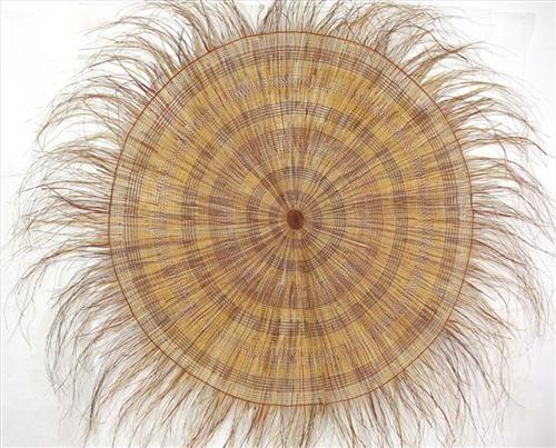 Artists usually use ngarakáya, pandanus spiralis, to weave fragrant, decorative round or oblong mats, as well as the less common triangular and conical shapes. The radial woven patterns of the finest round mats appear to vibrate with colour, sometimes regarded as an aesthetic manifestation of deep cultural meaning, as there is a significant spiritual dimension to pandanus mats.