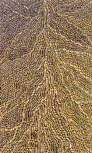 Sharon first saw her Grandfather’s Country from above during a small plane flight over Aputula in 2008. From that moment, she began painting the landscape from memory, experimenting with the forms and patterns she observed from the air. Her paintings map the surface of Aputula, tracing the movement of rivers, salt pans, and desert features with intricate topographical detail. Through this process, Sharon expresses a deep emotional and cultural connection to her family’s land.
