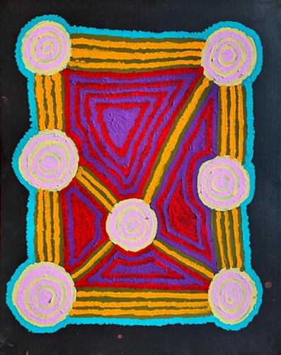 ‘Kungkarrangkalpa’ (The Seven Sisters or Pleaides) is significant Tjukurrpa (dreamtime). Its origins you may be familiar with in astronomy and its connection to ‘Wati Nyiru’ (Magic Man or Orion). The roots of this dreaming stems across indigenous groups around the world. The Australian Aboriginal songline is one part to the whole dreaming which can be traced all around the world. The ladies of the Ngaanyatjarra Lands depict their significant chapter and understanding of the journey of the sisters. The different versions of this story depend on where you live and the significance’s of local Tjukurrpa places.