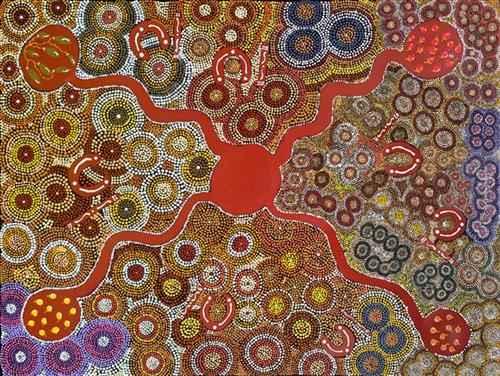 ‘Kungkarrangkalpa’ (The Seven Sisters or Pleaides) is significant Tjukurrpa (dreamtime). Its origins you may be familiar with in astronomy and its connection to ‘Wati Nyiru’ (Magic Man or Orion). The roots of this dreaming stems across indigenous groups around the world. The Australian Aboriginal songline is one part to the whole dreaming which can be traced all around the world. The ladies of the Ngaanyatjarra Lands depict their significant chapter and understanding of the journey of the sisters. The different versions of this story depend on where you live and the significance’s of local Tjukurrpa places.