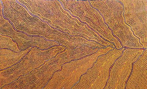 Sharon first saw her Grandfather’s Country from above during a small plane flight over Aputula in 2008. From that moment, she began painting the landscape from memory, experimenting with the forms and patterns she observed from the air. Her paintings map the surface of Aputula, tracing the movement of rivers, salt pans, and desert features with intricate topographical detail. Through this process, Sharon expresses a deep emotional and cultural connection to her family’s land.