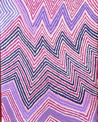This painting shows the design of her father Reggie Jackson’s male Tjara (shields). The shapes move across the canvas and then down again — the way Reggie always marked them. “This is my mark,” he would say. Katherine paints this design to carry his legacy forward. Reggie was born north of Blackstone and grew up around Mantamaru, living between both places. As one of the founding artists at Irrunytju, he was known for his vivid colours, broad brushstrokes, and the way he’d sing Tjukurrpa as he worked. A true bush man, strong in Law, full of humour, and devoted to his family. By painting his Tjara design, Katherine keeps his story alive.