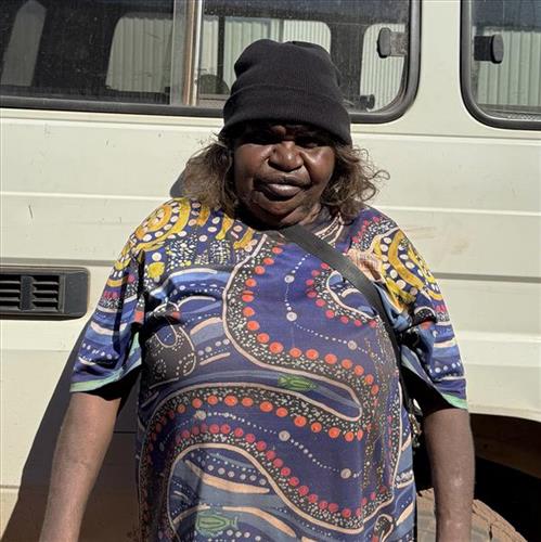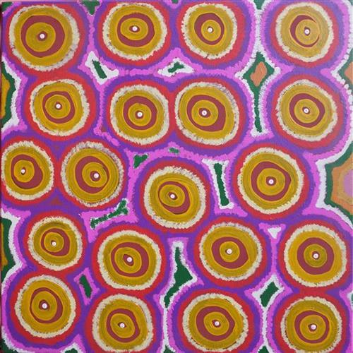 In this painting Dorothy has painted two emus and their chicks eating quandongs or native peach (red dots) from the quandong tree. The birds in the sky have quandongs in their beaks as they also enjoy eating the fruit. Quandongs were a traditionally a significant food source for Yarnangu in the Ngaanyatjarra Lands.