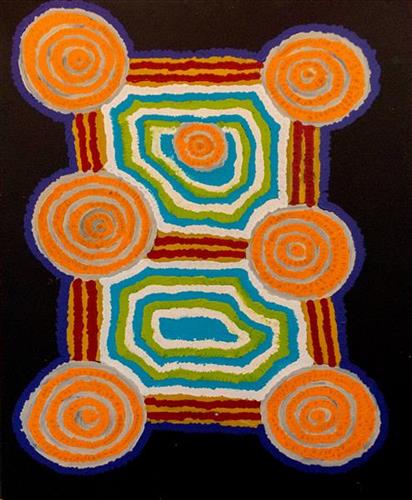 Angela has worked extensively as a ranger for 11 years across the Ngaanyatjarra Lands and has started painting recently at the art centre. She paints the Seven Sisters story given to her by her mother.