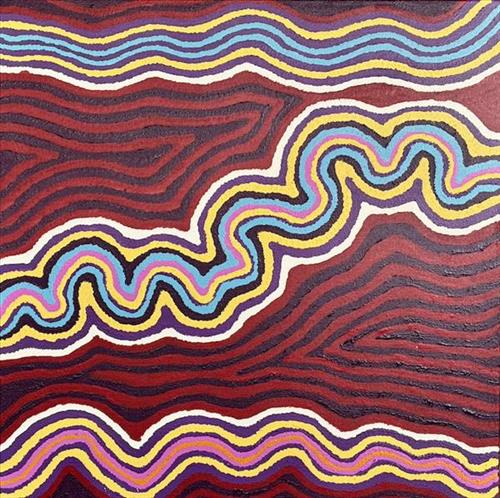 This painting maps the site of ‘Kuru Ala’ (two-eyes), a sacred place for women in Angilyiya’s mother’s country south of Papulankutja (Blackstone). Wati Nyiru was following them, disguising himself as a Quandong tree, a Yirli (wild fig tree), and then a carpet snake, spying on them as they made camp and dug for food.
