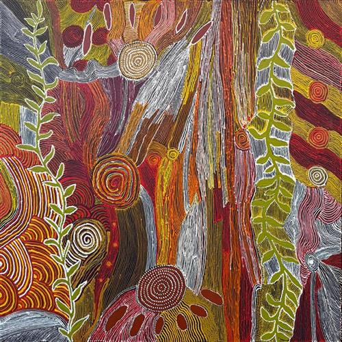 Janet started painting in 2003 at the newly established Papulankutja Artists originally based at the Women's Centre. Her paintings often depict the nganur (Bush Turkey) story, the Papulankutja story of the two goanna men or the Kungkarrangkalpa (Seven Sisters).