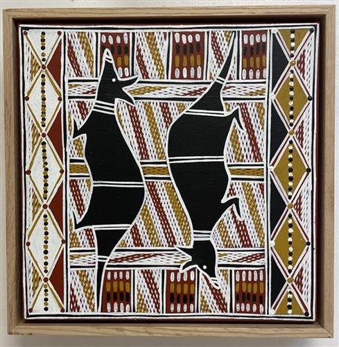 This Gupapuyngu painting depicts two wallabies, sacred dancers from the Dreamtime, performing in the sacred ground (Yirritja Ngarra ceremony) of Djiliwirri, Central North East Arnhem Land. This wallaby is the keeper of Niwuda. The painting’s intricate design reflects the importance of this Dreamtime story, which continues to be enacted through men’s dances today in sacred ceremonies.