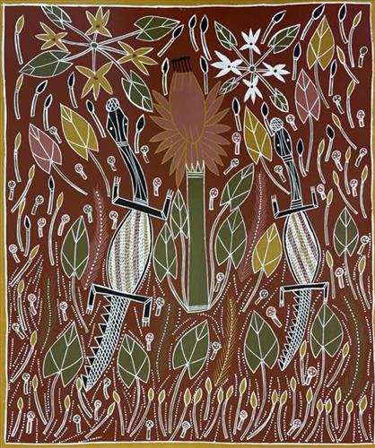 The creation story for Ganalbingu people took place near the middle section of the Glyde River where it becomes the Goyder River. Their land, Ngaliyindi, sits astride the Arafura Swamp in Central Arnhem Land. Many Ganalbingu artists paint totemic species significant to their clan. These can include baru (crocodile), banda (long necked turtle), buliya (catfish), yalman (waterlilies), gumang (magpie geese), dakawa (fresh water yabby), ratjuk (barramundi), warrnyu (flying fox) and more.