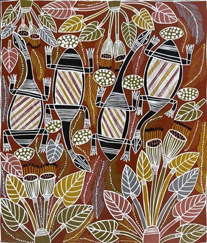 These creator spirits took many forms. When they gave the land to each group they also gave songs, dances, ceremony, the associated laws and language. The Creation story for Ganalbingu people took place near the middle section of the Glyde River where it becomes the Goyder River. Their land, Ngaliyindi, sits astride the Arafura Swamp in Central Arnhem Land. Some of their major Creative Beings include Banda (freshwater long neck turtle) and Yalman (water lilies).