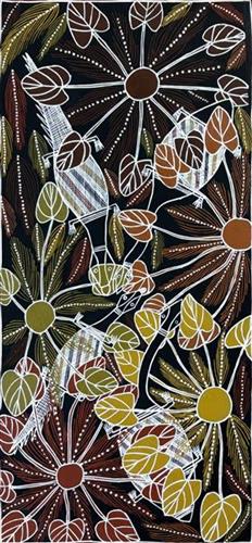 The creation story for Ganalbingu people took place near the middle section of the Glyde River where it becomes the Goyder River. Their land, Ngaliyindi, sits astride the Arafura Swamp in Central Arnhem Land. Many Ganalbingu artists paint totemic species significant to their clan. These can include baru (crocodile), banda (long necked turtle), buliya (catfish), yalman (waterlilies), gumang (magpie geese), dakawa (fresh water yabby), ratjuk (barramundi), warrnyu (flying fox) and more.