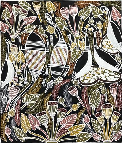 The creation story for Ganalbingu people took place near the middle section of the Glyde River where it becomes the Goyder River. Their land, Ngaliyindi, sits astride the Arafura Swamp in Central Arnhem Land. Many Ganalbingu artists paint totemic species significant to their clan. These can include baru (crocodile), banda (long necked turtle), buliya (catfish), yalman (waterlilies), gumang (magpie geese), dakawa (fresh water yabby), ratjuk (barramundi), warrnyu (flying fox) and more.