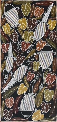 The creation story for Ganalbingu people took place near the middle section of the Glyde River where it becomes the Goyder River. Their land, Ngaliyindi, sits astride the Arafura Swamp in Central Arnhem Land. Many Ganalbingu artists paint totemic species significant to their clan. These can include baru (crocodile), banda (long necked turtle), buliya (catfish), yalman (waterlilies), gumang (magpie geese), dakawa (fresh water yabby), ratjuk (barramundi), warrnyu (flying fox) and more.