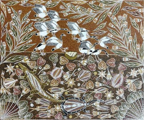 The creation story for Ganalbingu people took place near the middle section of the Glyde River where it becomes the Goyder River. Their land, Ngaliyindi, sits astride the Arafura Swamp in Central Arnhem Land. Many Ganalbingu artists paint totemic species significant to their clan. These can include baru (crocodile), banda (long necked turtle), buliya (catfish), yalman (waterlilies), gumang (magpie geese), dakawa (fresh water yabby), ratjuk (barramundi), warrnyu (flying fox) and more.