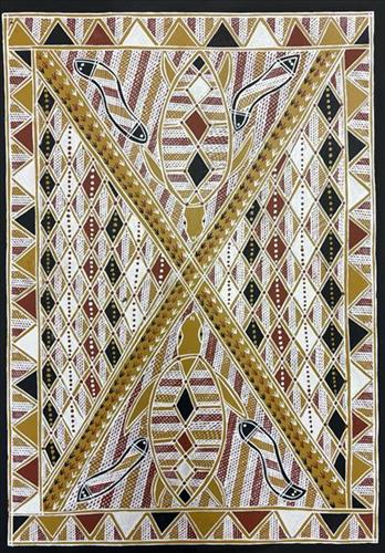 Peter has painted a saltwater Yirritja story from one of his homelands on Galiwinku (Elcho Island).